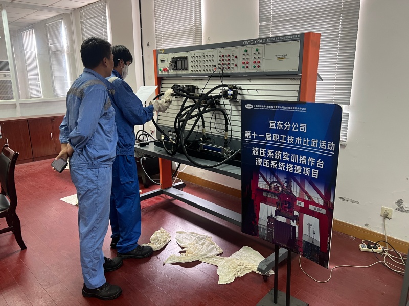 此次技术比武紧扣岗位实际需求设置竞赛项目,涵盖理论测试与实操考核两大类别共6项内容。其中,理论测试重点考察职工对专业知识、安全规范的掌握程度;实操环节则直击生产维修核心场景,包括实训室电气控制系统故障排除、双箱吊具故障排除、液压系统实训操作台油路搭建与故障排查等,每项考核均模拟实际工作中的难点问题,全面检验参赛职工的技术功底与应急处置能力。