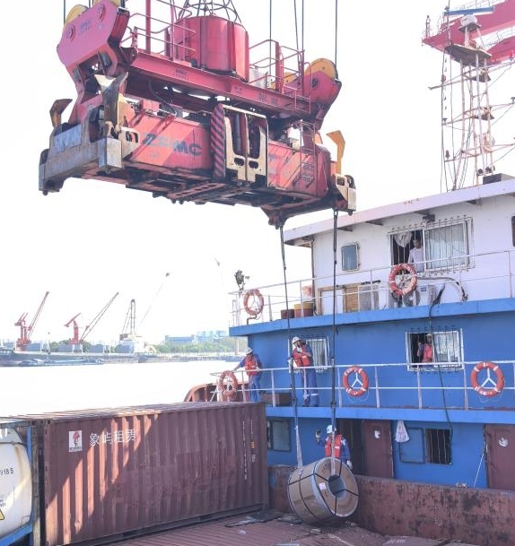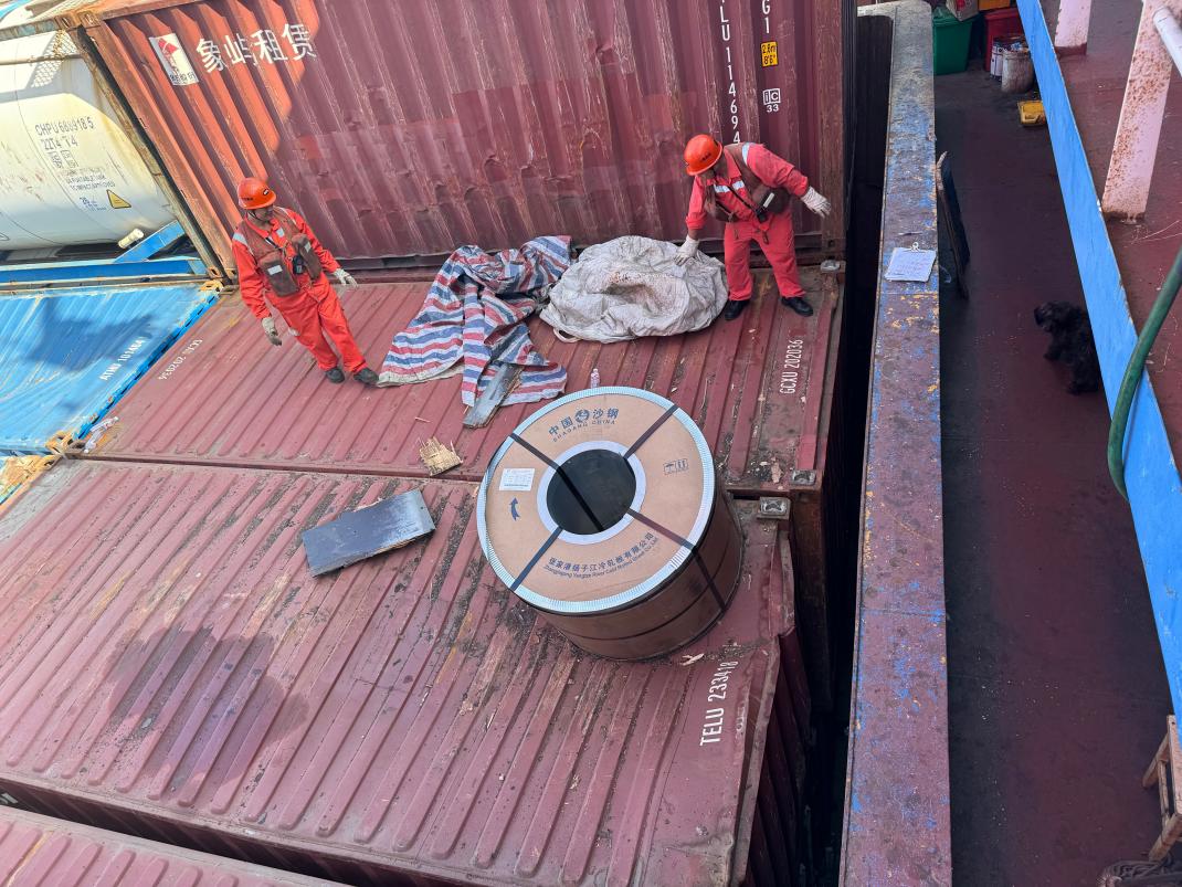 9点30分,“远顺19”缆绳带妥,安全靠泊码头。现场划出“红区”,无关人员全部清场。在现场管理人员的统一指挥下,“党工团突击队”第一时间下舱复查,手测、眼瞄,迅速报出情况:“卷钢无棱角缺口,绑带完好,可以作业!”随后码头工人立刻登船对冷轧钢卷进行吊装绑扎固定。