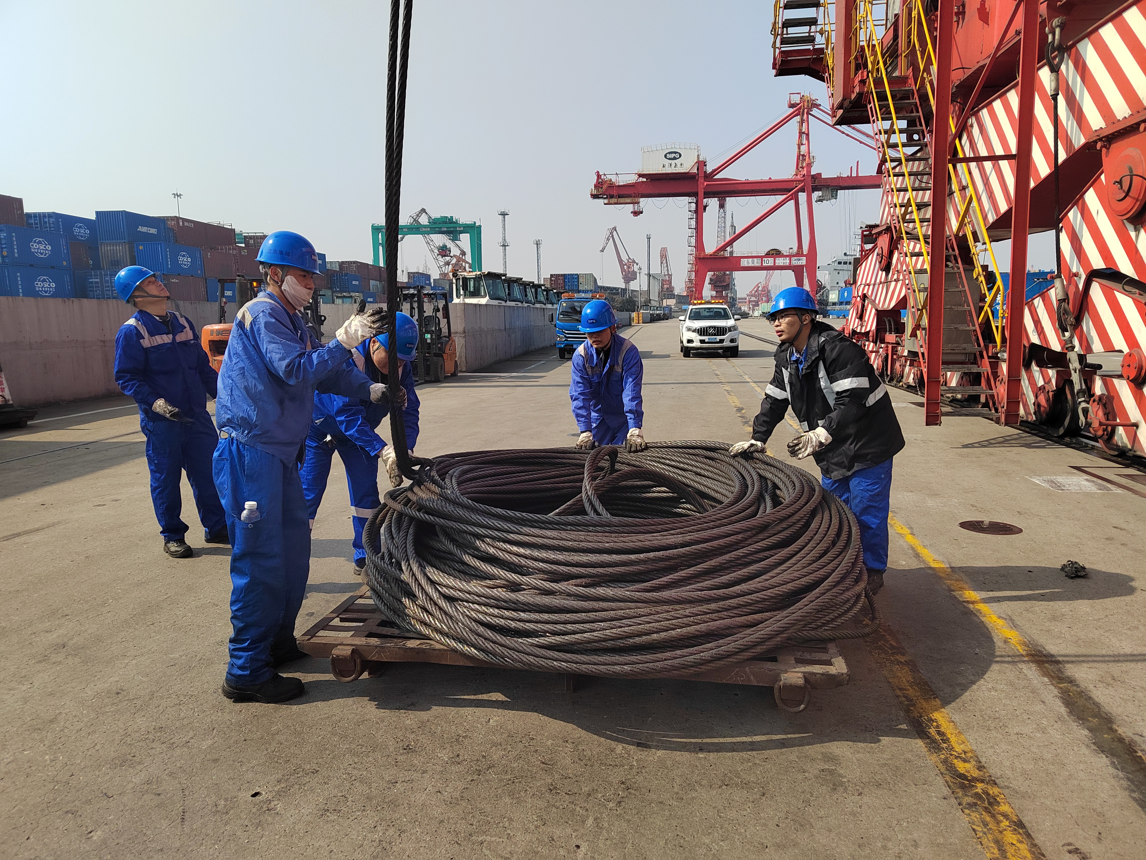 工程技术部设备二组在设备安全检查中,发现Y104桥吊起升钢丝绳存在安全隐患。作为桥吊作业的核心部件,钢丝绳隐患直接关乎后续生产安全,而此时正值船舶集中靠泊的繁忙时段,抢修刻不容缓。为抢抓抢修时间,班组当即取消原定的新春茶话会,全体党工团突击队员主动请缨,在无外协人员支援的情况下,迅速集结投入抢修作业。突击队员们连续奋战6小时,顾不上吃午餐、推迟了与家人的团圆,一心扑在钢丝绳更换作业上。凭借娴熟的专业技术和紧密的团队配合,以最快速度完成抢修,及时消除设备安全隐患,为春节期间港口生产筑牢了设备安全防线。